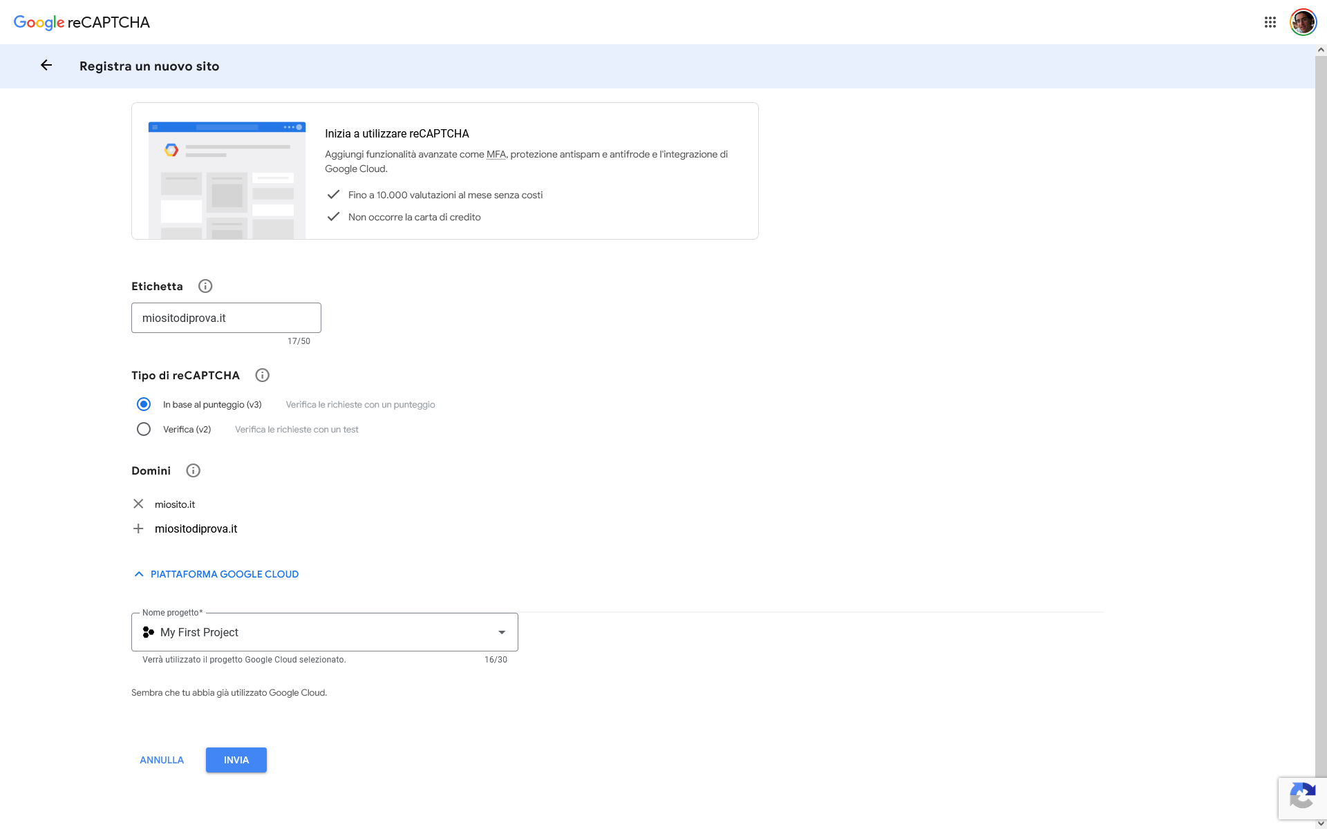 Scegli reCAPTCHA v3